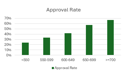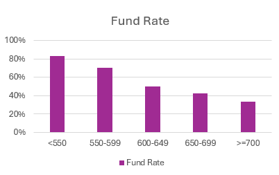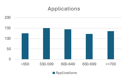 For example, reports can be developed by credit score (shown below), industry, risk tier, time in business, or any valuable segmentation attribute